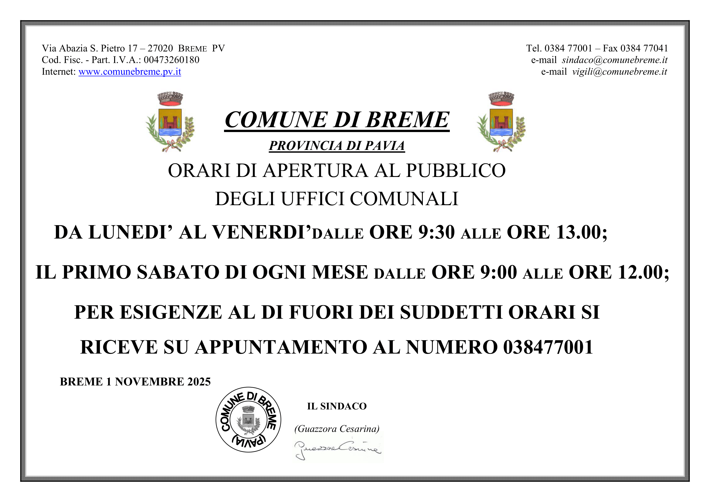 Si informa che, a partire dal 1° novembre 2025, gli orari di apertura al pubblico degli uffici comunali saranno modificati come segue: